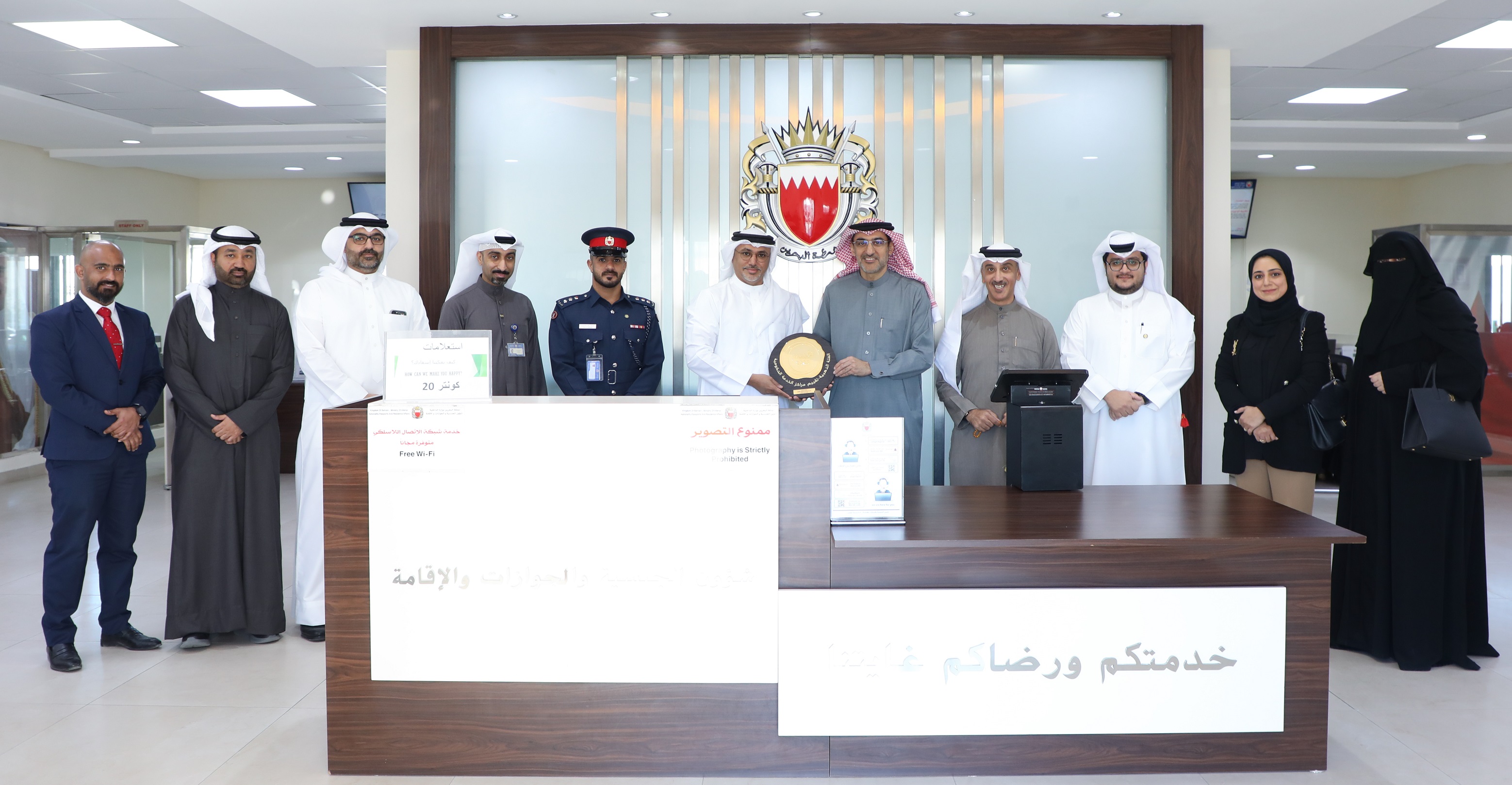 On this occasion, the winning directorates, the National, Passports and Residence Affairs Centres (Isa Town and Security Complex), Customs Affairs (land, sea and air ports), General Directorate of Civil Defence (Security Complex), the General Directorate of Traffic ( Driving Learning School) and the Information and eGovernment Authority (Smart Card Centre in Isa Town), received the golden plaques.