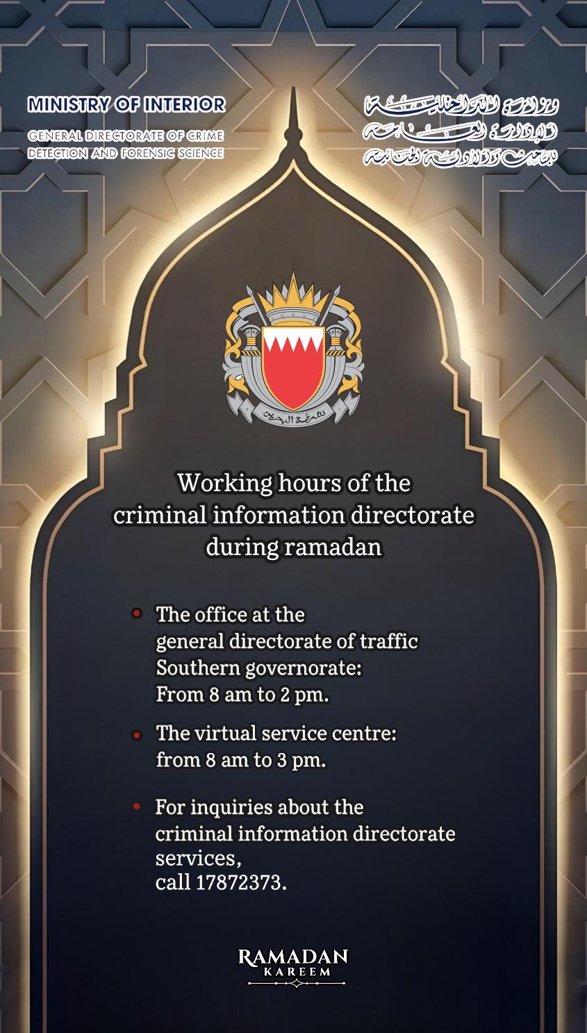 The Criminal Information Directorate of the General Directorate of Criminal Investigation and Forensic Science announced the Ramadan working hours. Its office at the General Directorate of Traffic in the Southern Governorate will be from 8 a.m. to 2 p.m., while the virtual service centre will be from 8 a.m. to 3 p.m. It is essential to book an appointment via the Mawaeid app.