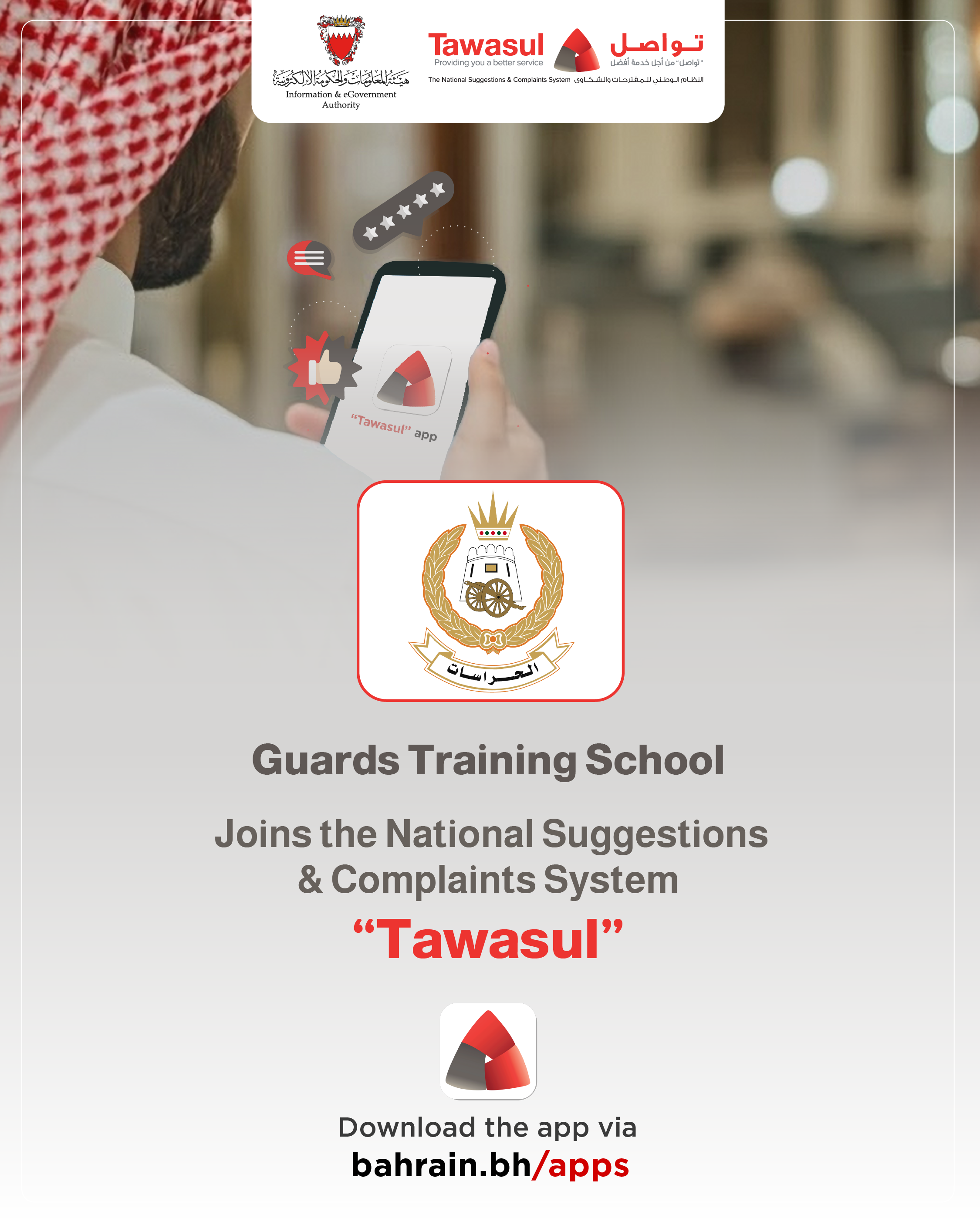 The Ministry of Interior announced that, in cooperation between the General Directorate of Guards and the Information & eGovernment Authority, the Guards Training School has joined the National Suggestions and Complaints System “Tawasul,” which is available to citizens and residents via Bahrain.bh/Tawasul and by downloading the “Tawasul” app available through the eGovernment application store at bahrain.bh/apps.