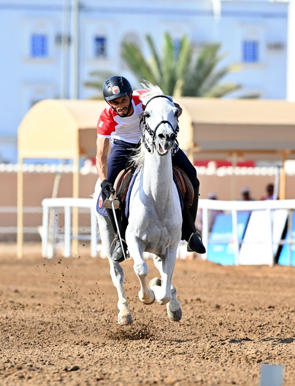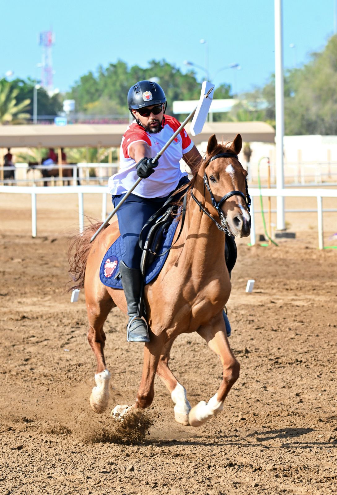 The Bahraini Tent Pegging Team, represented by the Ministry of Interior team, won first place in the sword pegging competition while participating in the third Gulf Cooperation Council Beach Games in Muscat.