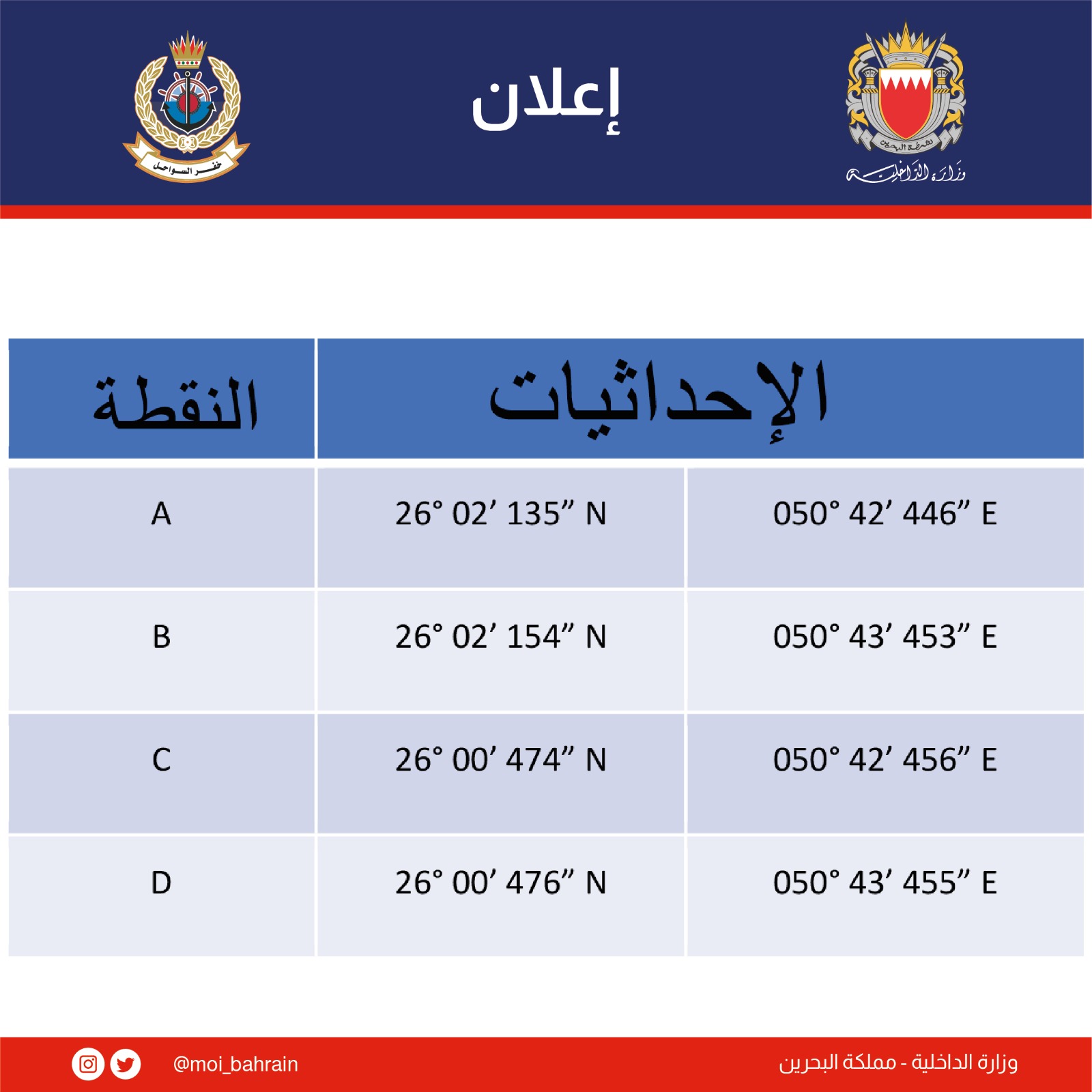 حفاظاً على سلامة البحارة ومرتادي البحر في ظل ما تتعرض له مملكة البحرين من عدوان إيراني سافر ، باستخدام الصواريخ والطائرات المسيرة ، وما يشكله ذلك من خطورة كبيرة على سلامة المواطنين والمقيمين ، تعلن وزارة الداخلية ، حظر الحركة البحرية لمرتادي البحر من مستخدمي سفن الصيد والنزهة ، وذلك في ضوء الإجراءات المتخذة لحماية سواحل البحرين