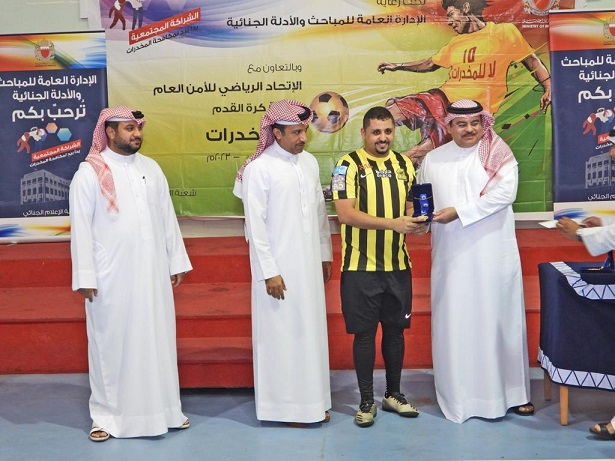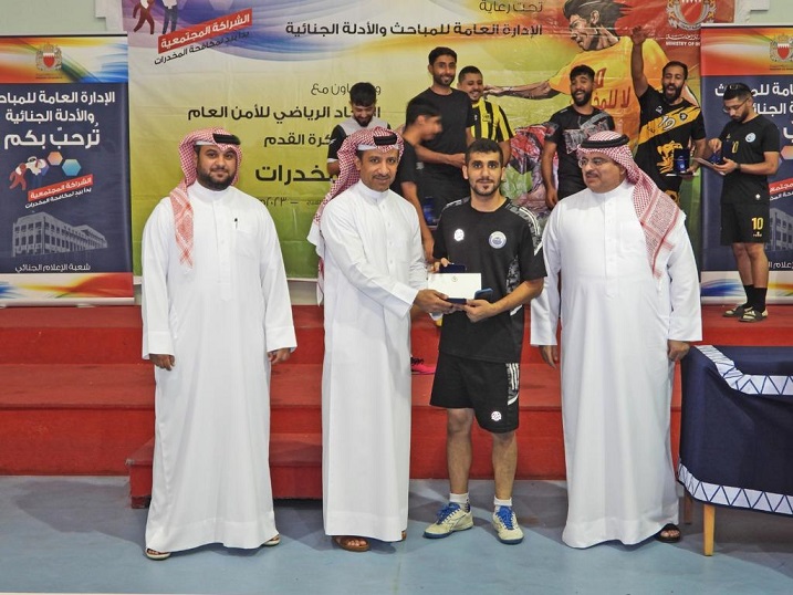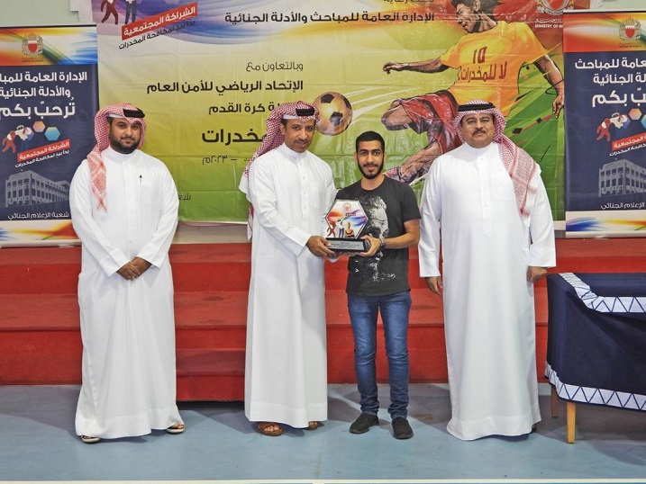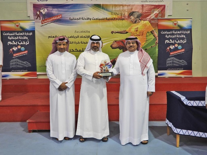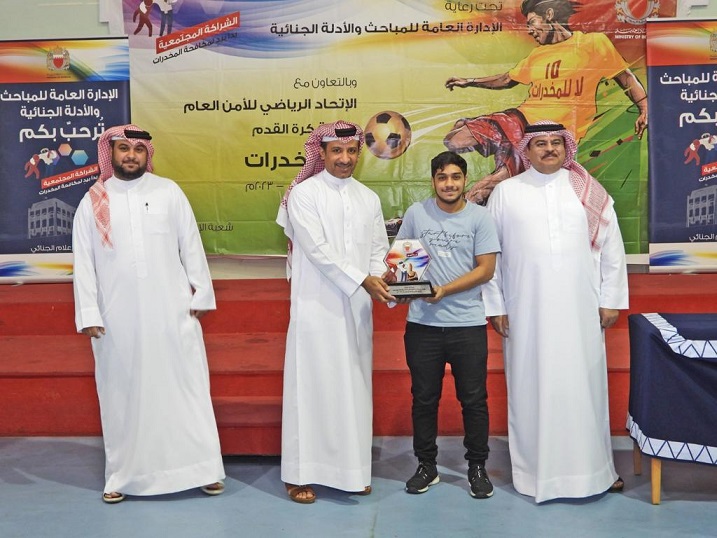 تعزيزاً لمبدأ الشراكة المجتمعية والانتماء الوطني الذي تنتهجه وزارة الداخلية وضمن فعاليات الاحتفال باليوم العالمي لمكافحة المخدرات ، أقامت الإدارة العامة للمباحث والأدلة الجنائية بطولة كرة القدم الثانية تحت شعار (لا للمخدرات) بين ناديي الدير وسماهيج الرياضيين .