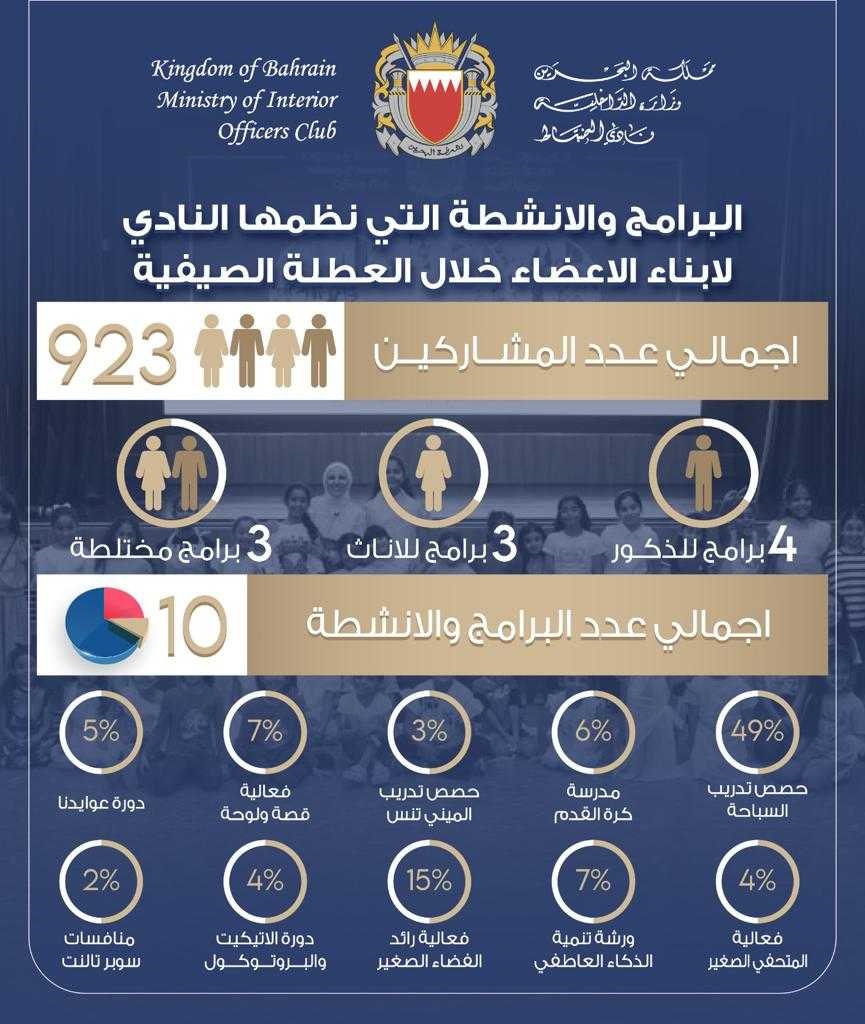 اختتم نادي ضباط الأمن العام البرنامج الصيفي لأبناء أعضاء النادي والذي أقيم بتوجيه ودعم من الفريق أول معالي الشيخ راشد بن عبدالله آل خليفة وزير الداخلية، و شارك فيه (923) طفلًا ، وتضمن فعاليات و أنشطة رياضية واجتماعية وثقافية ، وذلك بهدف تثقيف الأطفال وتعزيز قدراتهم ومهاراتهم في مختلف المجالات .
