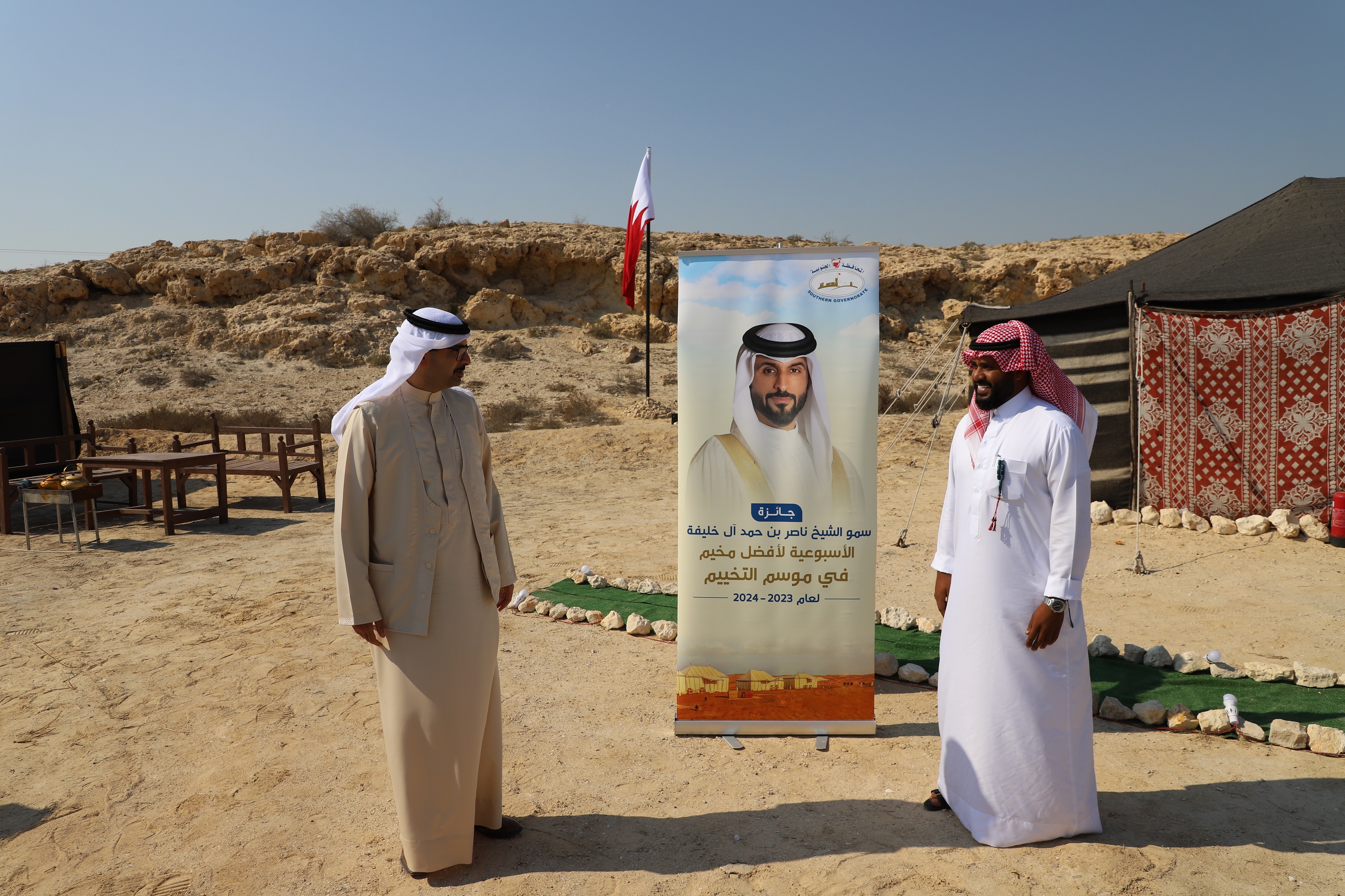 تواصلت جائزة سمو الشيخ ناصر بن حمد آل خليفة ممثل جلالة الملك للأعمال الإنسانية وشؤون الشباب الأسبوعية في اختيار أفضل مخيم في موسم البر 2023-2024، حيث قام سمو الشيخ خليفة بن علي بن خليفة آل خليفة محافظ المحافظة الجنوبية ، بتكريم الفائزان خالد محمود جناحي وعبدالله عتيق بشير، وذلك بتسليمهما جوائز المسابقة في أسبوعها الثالث، بحضور العقيد حمد محمد الخياط نائب المحافظ، وعدد من ضباط الإدارات الأمنية والمسؤولين بالمحافظة الجنوبية.