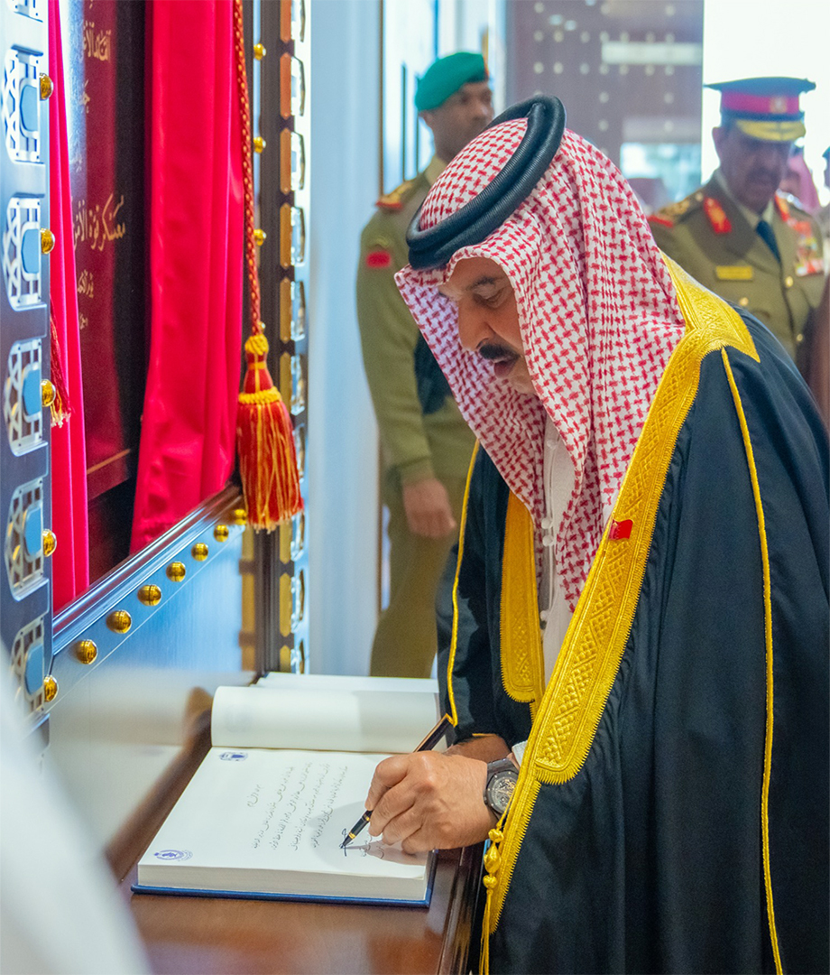 ثم تفضل جلالة الملك المعظم ، القائد الأعلى للقوات المسلحة بإزاحة الستار عن اللوحة التذكارية وافتتاح مبنى القيادة ، حيث سجل جلالته ، كلمة في سجل الزوار، هذا نصها: "يطيب لنا أن نعرب عن خالص شكرنا وتقديرنا لمعالي وزير الداخلية وكافة منتسبي الوزارة على عطائهم الوطني وجهودهم المخلصة في حفظ الأمن ، مؤكدين أن ما شهدناه اليوم من منشآت جديدة وإمكانات أمنية ولوجيستية في معسكر سافرة ، يعكس الجاهزية العالية لحماية أمن البحرين والقدرة على مواجهة التحديات".