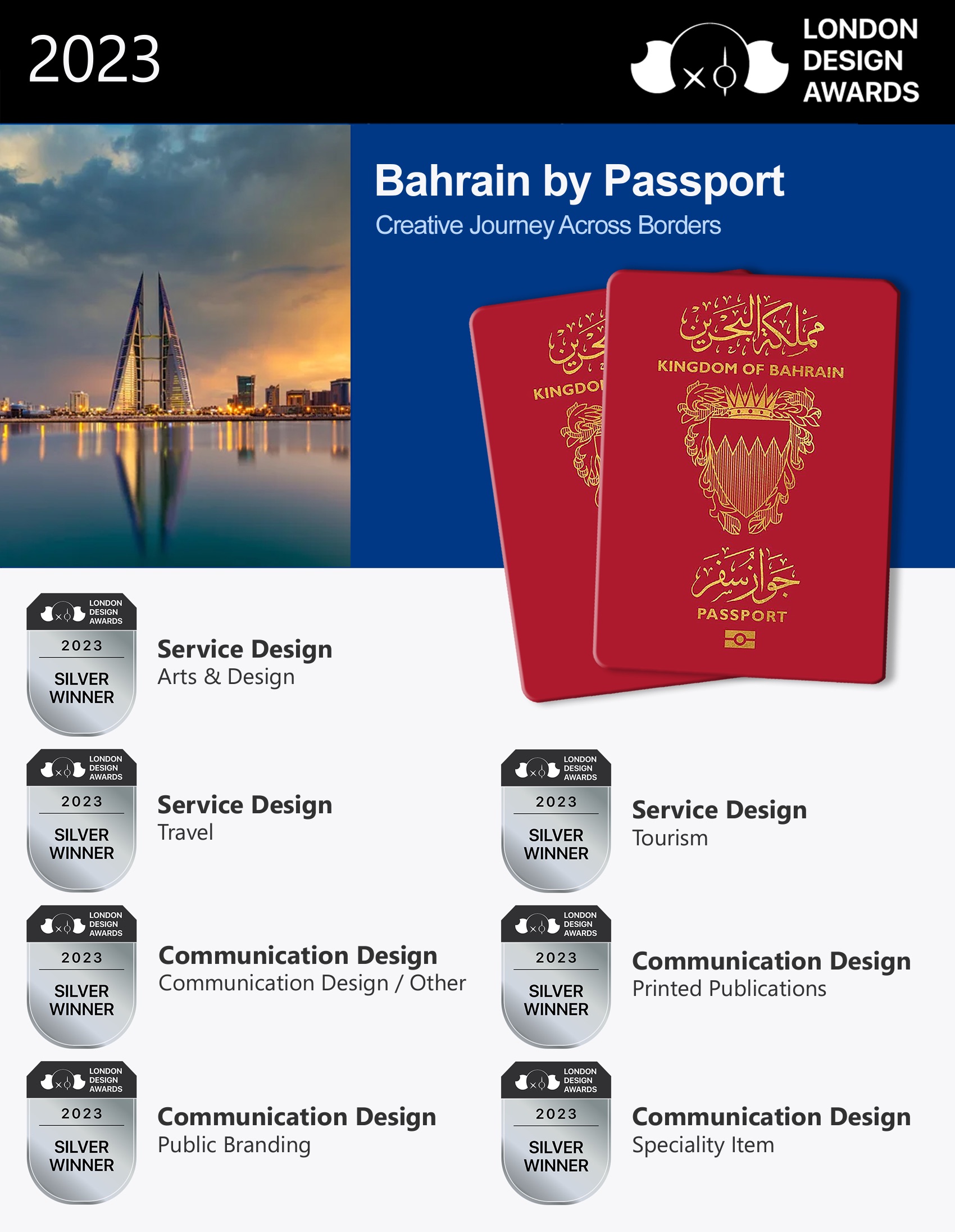 في انجاز دولي يؤكد الرؤية الثاقبة والتوجيهات السديدة لصاحب السمو الملكي الأمير سلمان بن حمد آل خليفة، ولي العهد رئيس مجلس الوزراء ، حفظه الله ، ودعم سموه تنفيذ مبادرات تطوير خدمات شئون الجنسية والجوازات والإقامة ، والتي أطلقها مجلس الوزراء الموقر ، ضمن خطة التعافي الاقتصادي ، فاز جواز السفر الالكتروني لمملكة البحرين ، والذي دشنه الفريق أول معالي الشيخ راشد بن عبدالله آل خليفة وزير الداخلية في مارس 2023 بثلاث جوائز ذهبية وسبع فضية من بين جوائز لندن للتصميم ، والتي تعد مسابقة دولية في مجال التصاميم الاستثنائية والمشاريع الإبداعية المتميزة في كافة دول العالم ، وتنافس فيها هذا العام ، ثلاثة آلاف مشارك من 45 دولة ، حيث تهدف إلى تشجيع الإبداع والابتكار من خلال تغطية مجموعة واسعة من التخصصات، منها الهندسة المعمارية والتصميم الداخلي وتصميم المنتجات والتصميم الجرافيك والتصميم الرقمي.