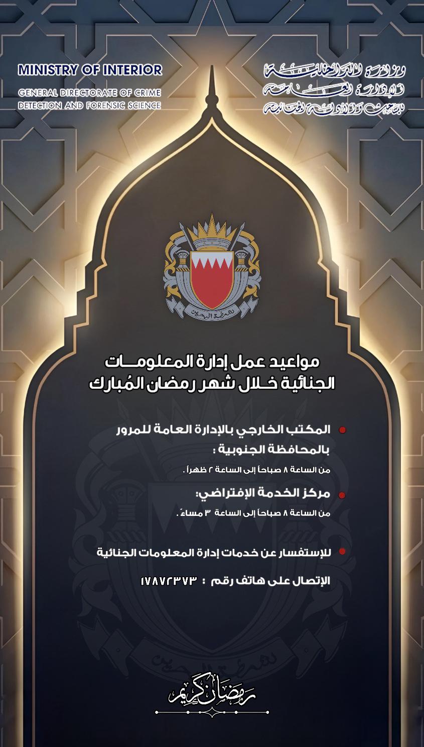 أعلنت إدارة المعلومات الجنائية بالإدارة العامة للمباحث والأدلة الجنائية بأن مواعيد العمل خلال شهر رمضان المبارك بالمكتب الخارجي التابع لها في مقر الإدارة العامة للمرور بالمحافظة الجنوبية سوف تكون من الساعة 8 صباحاً ولغاية الساعة 2 ظهراً ، فيما سيكون بمركز الخدمة الافتراضي من الساعة 8 صباحاً ولغاية الساعة 3 مساءً ، مع ضرورة حجز موعد قبل الذهاب للفرع عن طريق تطبيق (مواعيد) .