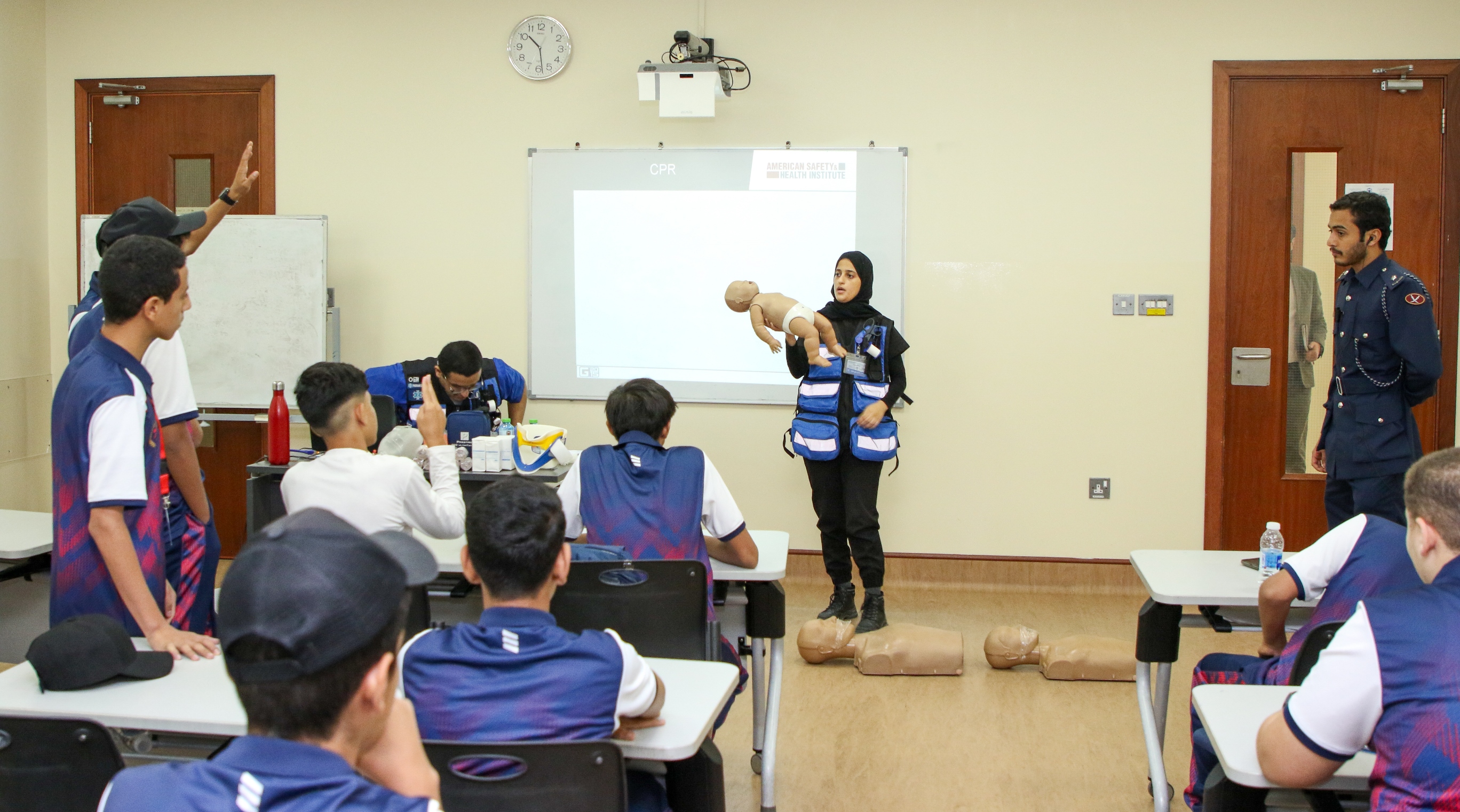في اطار حرص المعسكر الصيفي للأكاديمية الملكية للشرطة، الذي يُعد أحد مبادرات الخطة الوطنية لتعزيز الانتماء الوطني وترسيخ قيم المواطنة "بحريننا"، ويقام بالتعاون مع صندوق العمل "تمكين"، على إعداد برامج وأنشطة نوعية تتناول القيم الوطنية وتنمية المهارات الشخصية والمهنية لبناء جيل قادر على تحمل المسؤولية والمساهمة في تقدم الوطن ، حيث شارك الطلبة في ورشة عمل " روحك غالية" والتي تهدف تزويد الطلاب اسس وقواعد التعامل الصحيح مع حالات الطوارئ المختلفة وذلك من خلال غرز حب العمل التطوعي ومساعدة الآخرين .