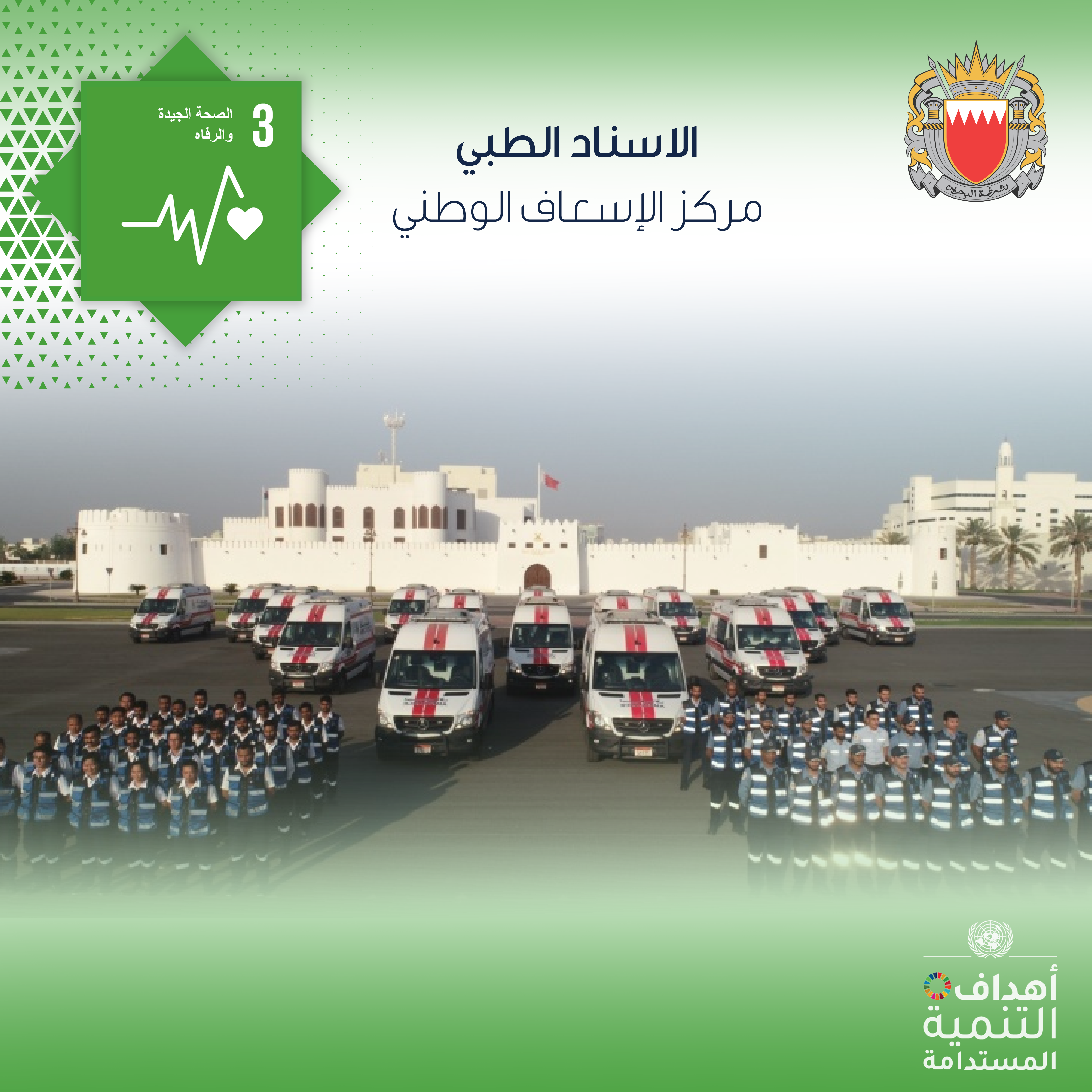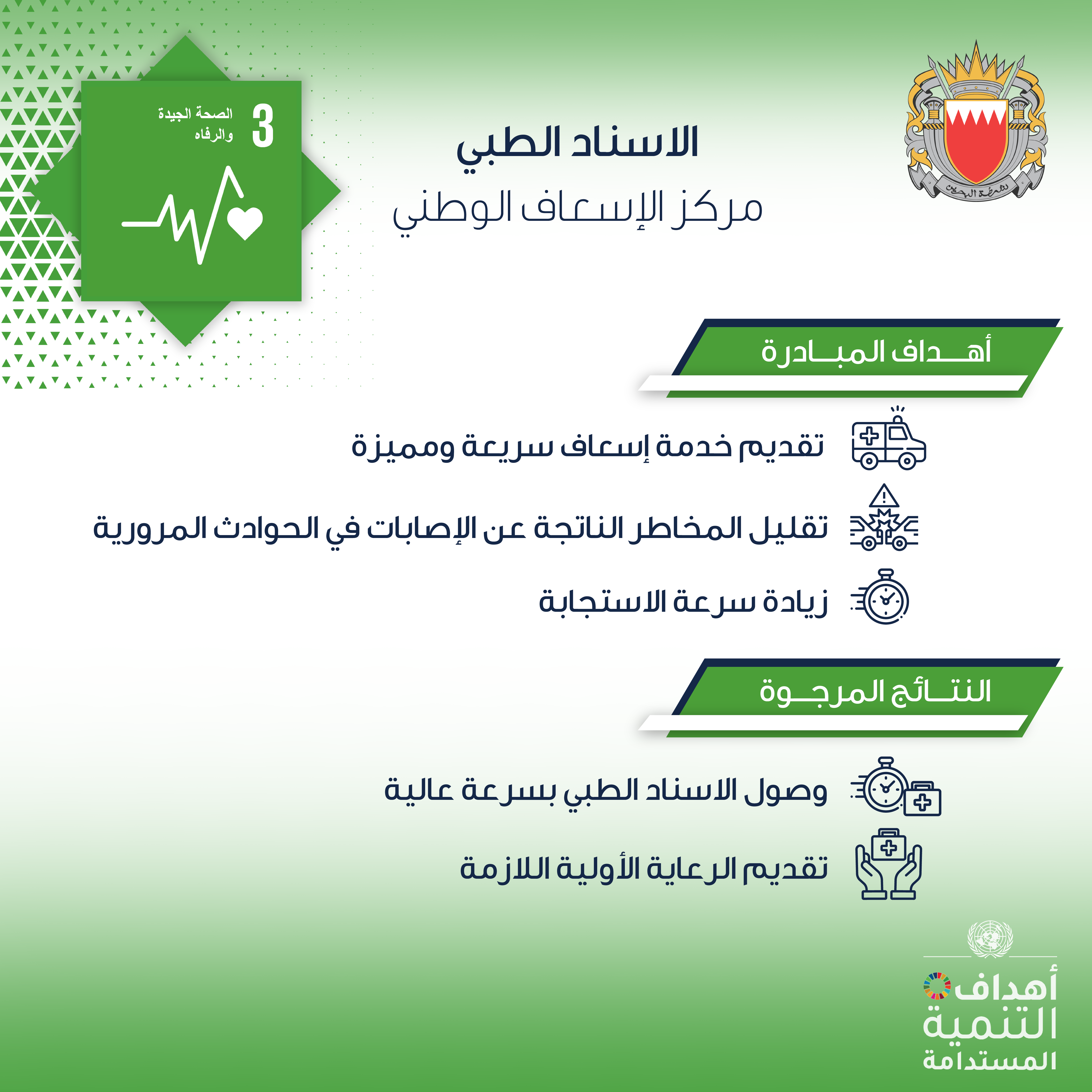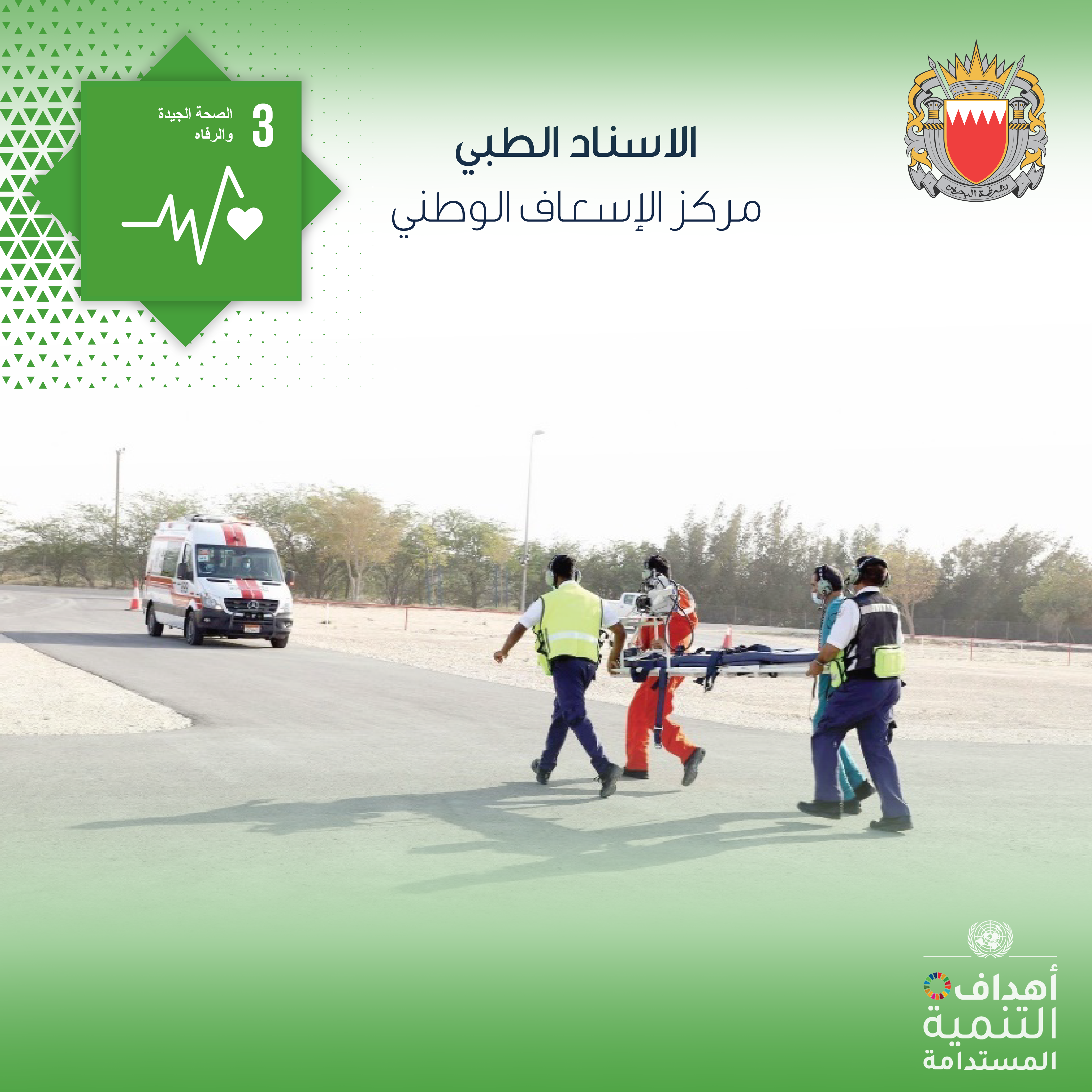 تنفيذا لتعليمات الفريق أول معالي الشيخ راشد بن عبدالله آل خليفة وزير الداخلية ، وفي إطار حرص الوزارة على تطبيق أهداف التنمية المستدامة عبر تنفيذ عدد من المبادرات النوعية في هذا الشأن ، يعمل مركز الإسعاف الوطني على التحسين المستمر في معدلات سرعة الاستجابة لحالات الطوارئ من خلال الوصول السريع لموقع الحدث وتقديم الخدمات الصحية اللازمة في الموقع قبل نقلهم إلى المستشفى.