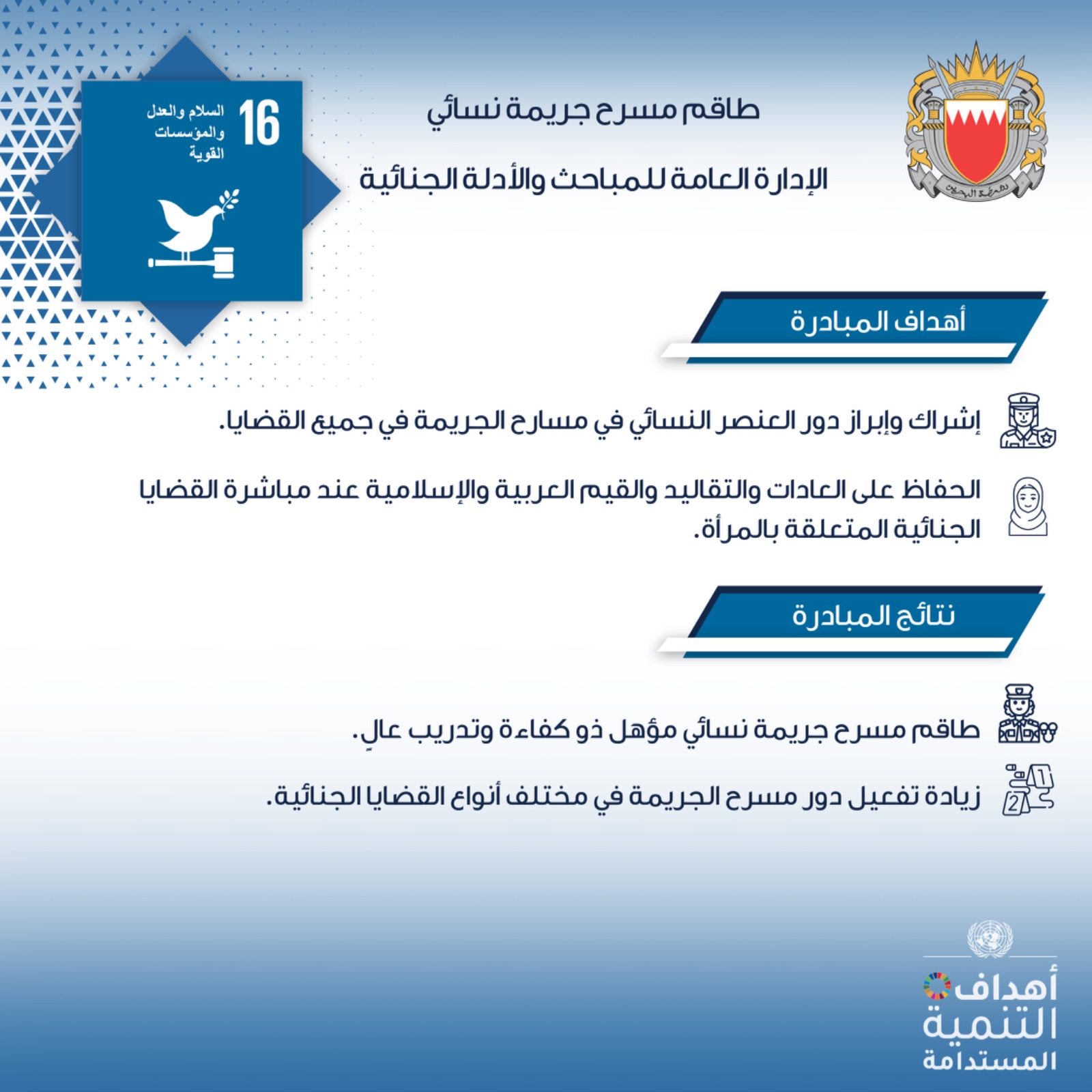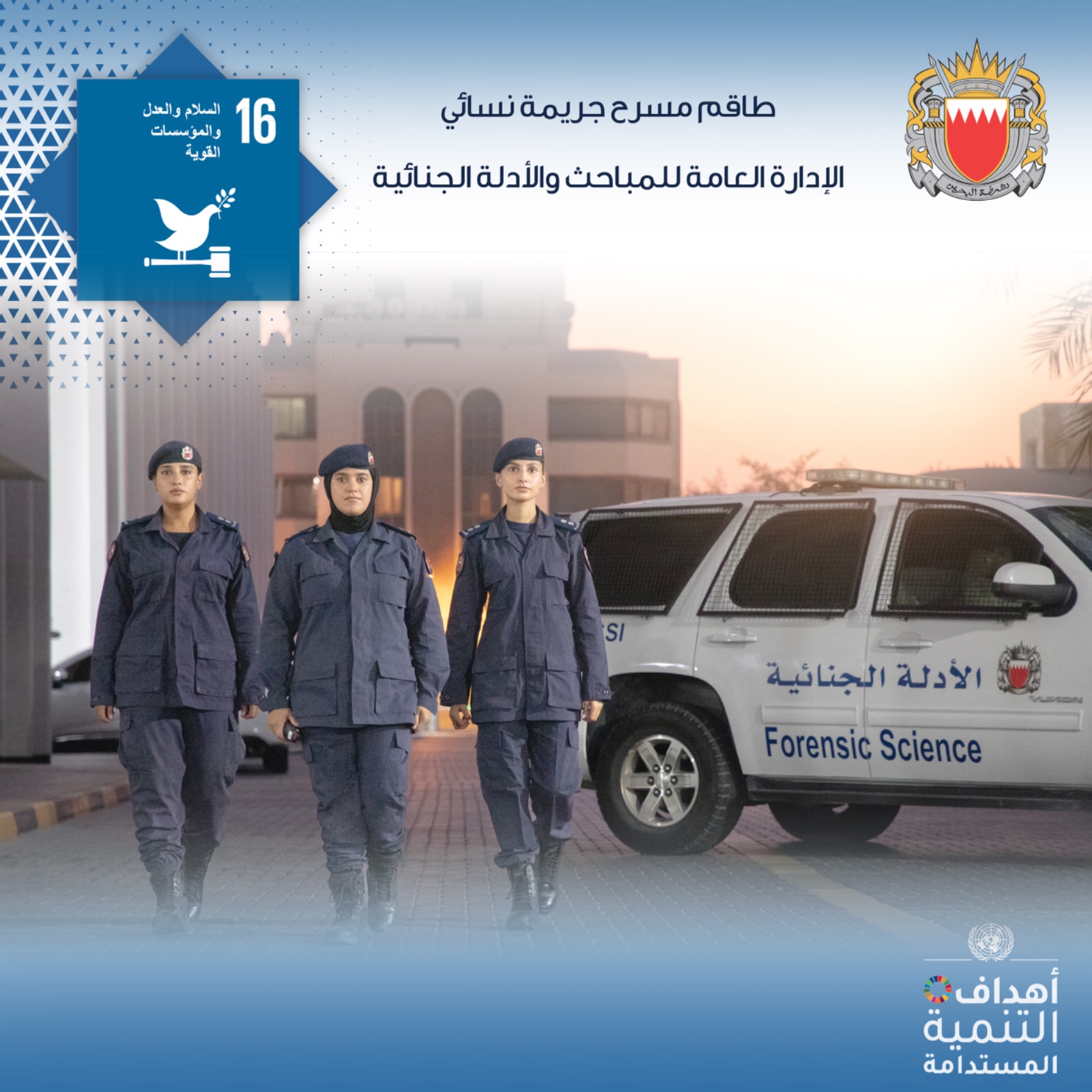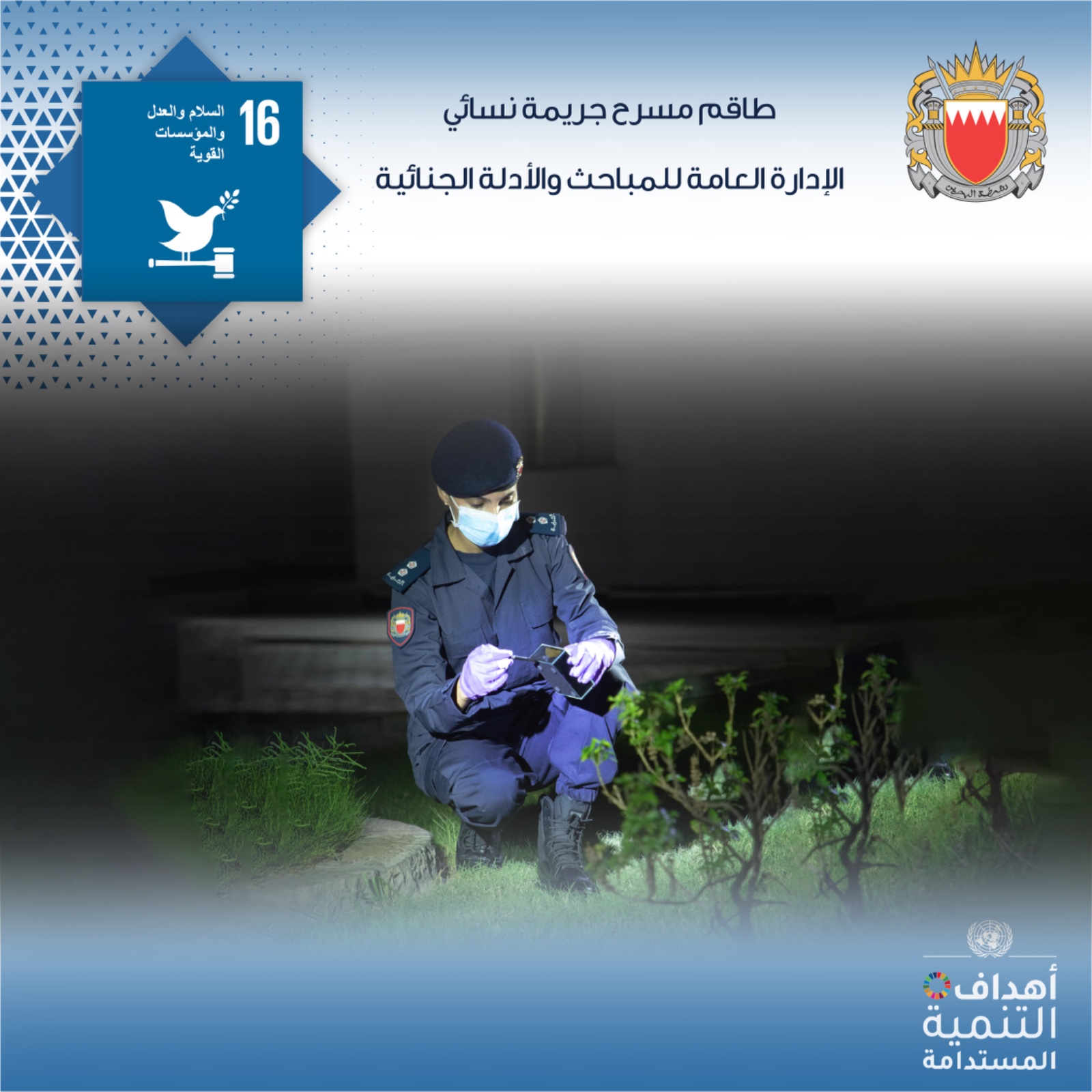 في إطار حرص وزارة الداخلية على تطبيق أهداف التنمية المستدامة عبر تنفيذ عدد من المبادرات النوعية في هذا الشأن، قامت الإدارة العامة للمباحث والأدلة الجنائية بتشكيل طاقم مسرح جريمة نسائي.