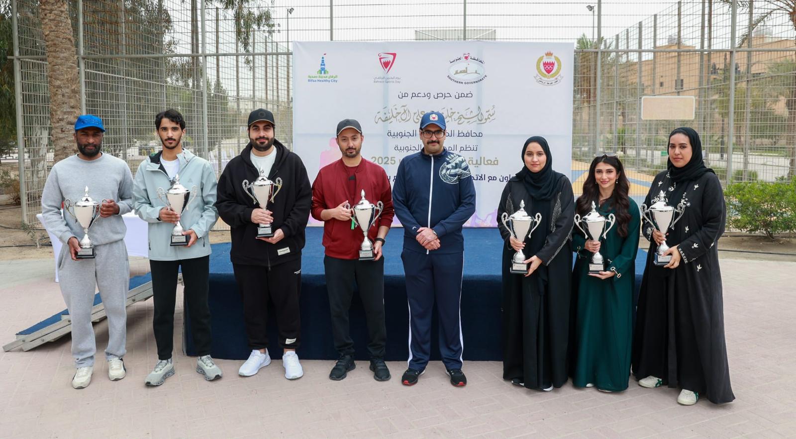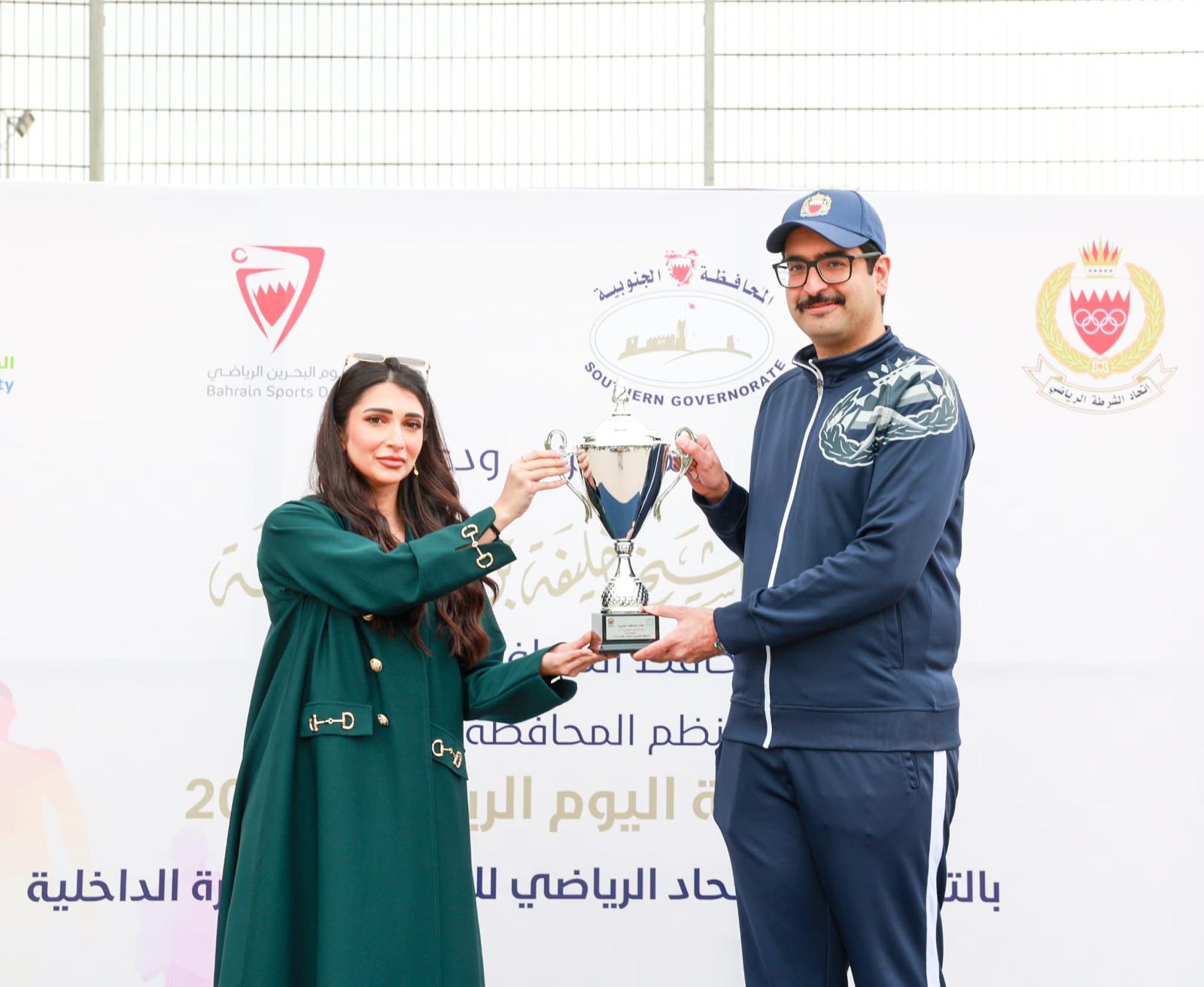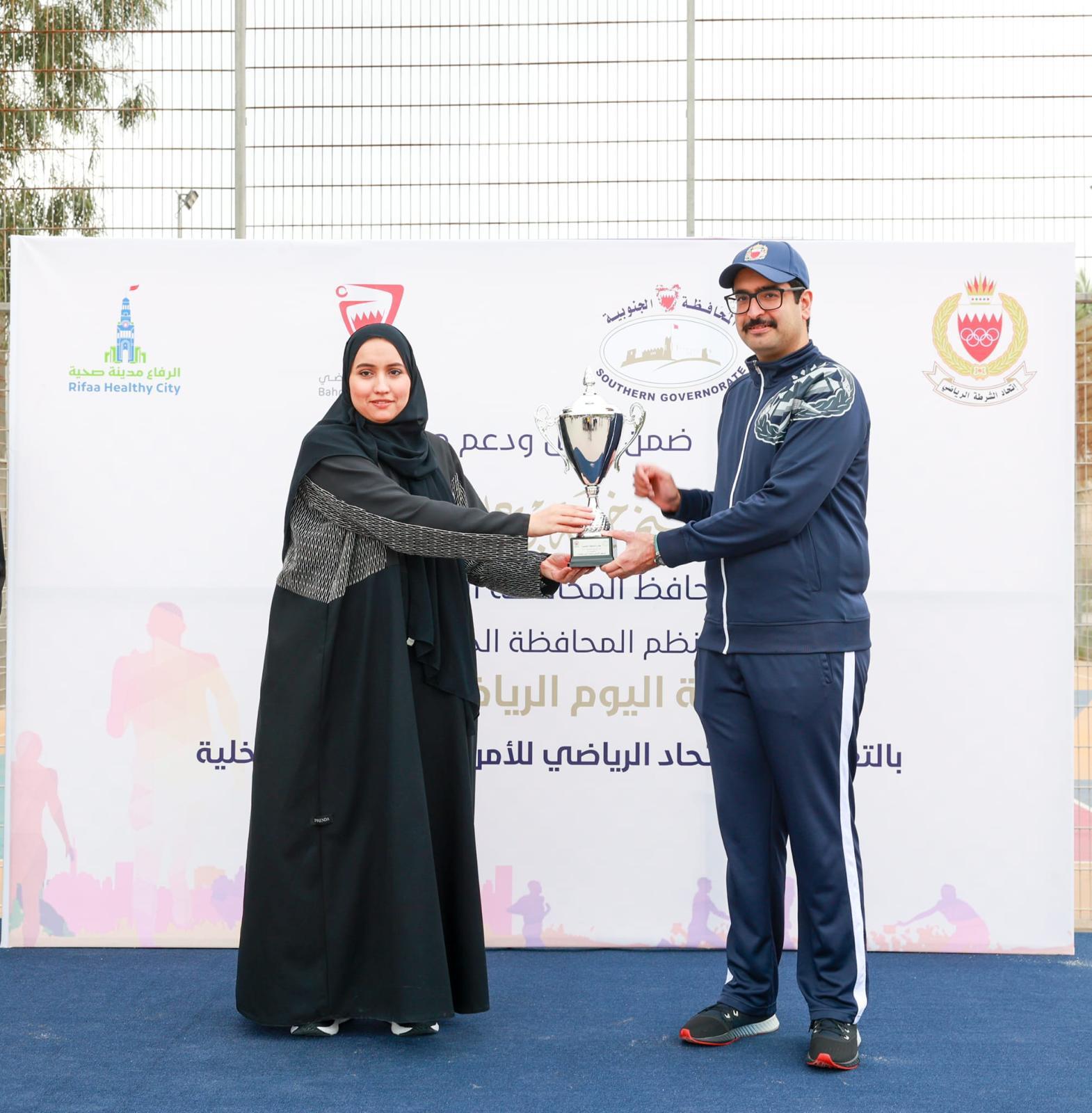 بمشاركة وحضور سمو الشيخ خليفة بن علي آل خليفة محافظ المحافظة الجنوبية، نظمت المحافظة الجنوبية فعالية اليوم الرياضي بالتعاون مع الاتحاد الرياضي للأمن العام بوزارة الداخلية ، حيث تضمنت الفعالية جملة من المنافسات والمسابقات الرياضية بهدف تعزيز الوعي بأهمية الرياضة ودورها في حياة الفرد والمجتمع، وذلك في حديقة خليفة الكبرى بالرفاع، بحضور سعادة العميد حمد محمد الخياط نائب المحافظ، والبروفيسور منى راشد الزياني، رئيس مجلس الإدارة ورئيس مجلس الأمناء في الجامعة الخليجية، ومؤسسات المجتمع المدني والجمعيات الاهلية، ومشاركة منتسبي واهالي المحافظة.