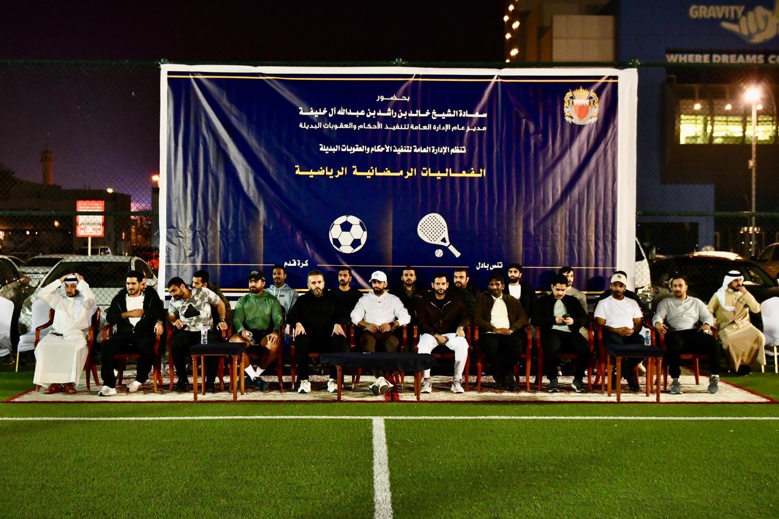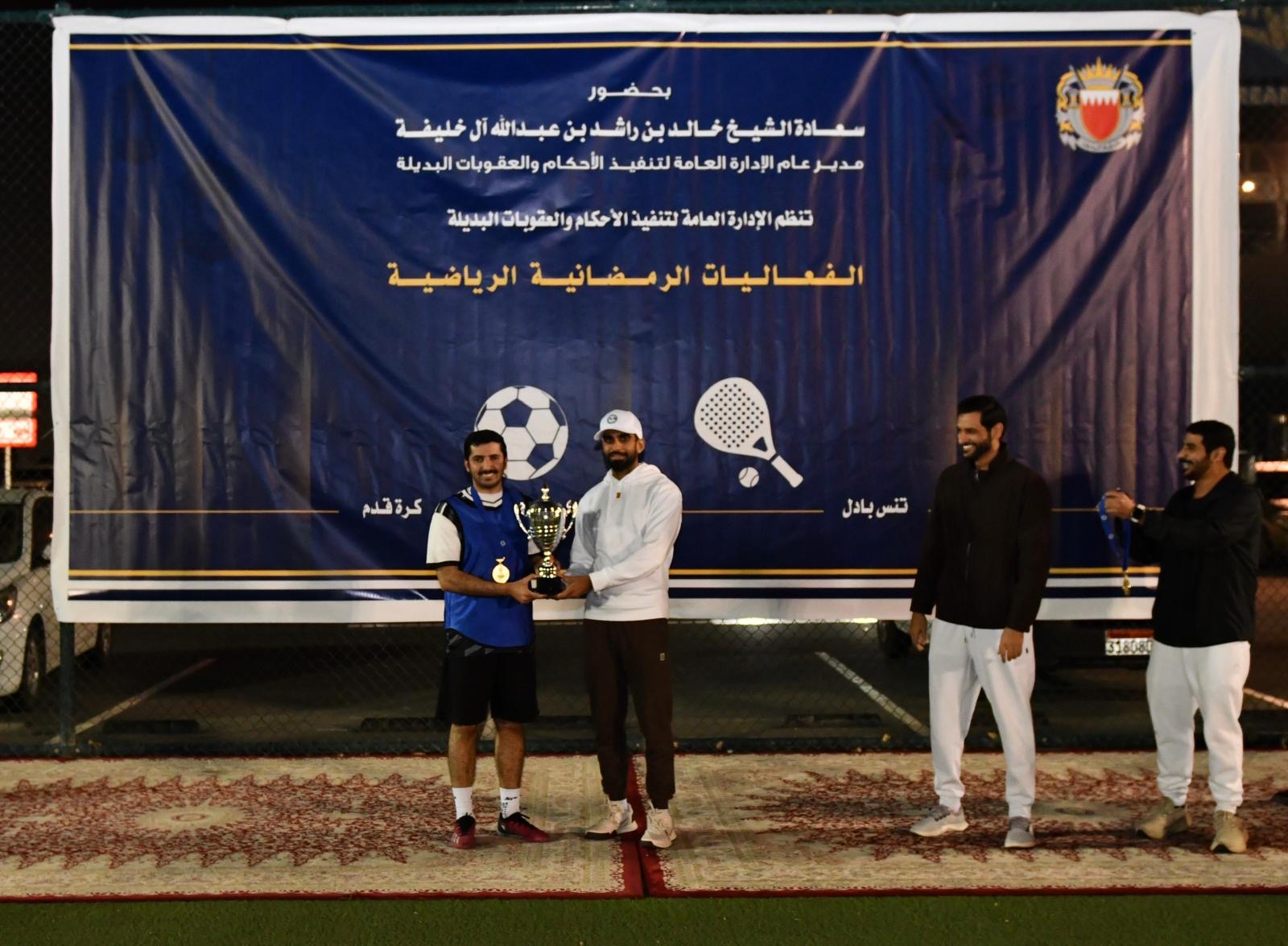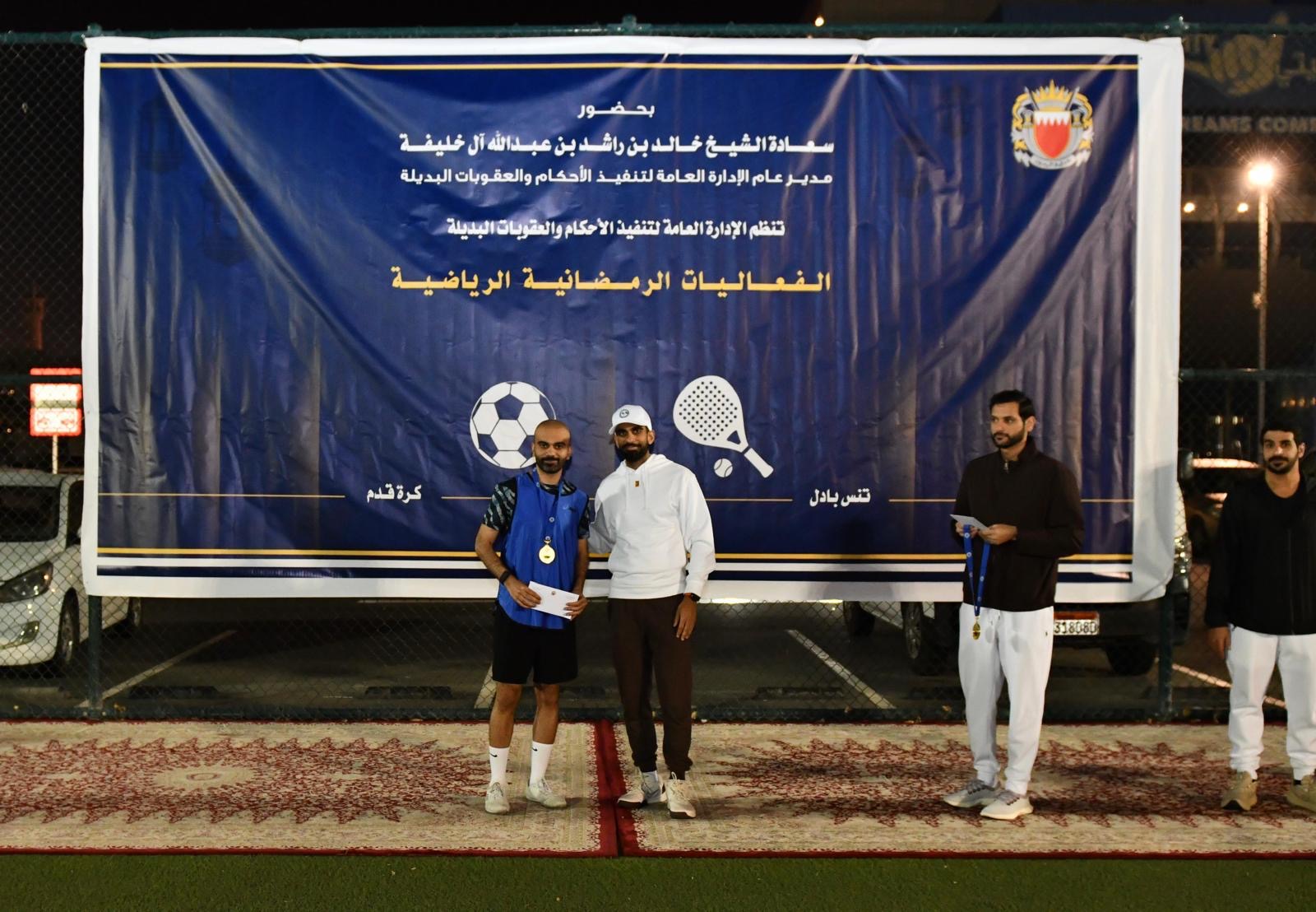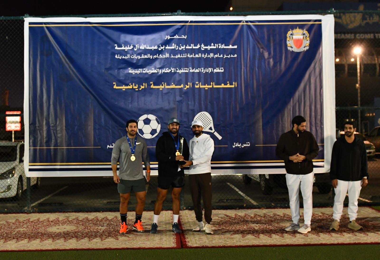 توّج سعادة الشيخ خالد بن راشد آل خليفة مدير عام الإدارة العامة لتنفيذ الأحكام والعقوبات البديلة، الفرق الفائزة في البطولة الرمضانية الثالثة لكرة القدم والبادل، والتي نظمتها الإدارة على ملاعب “جرافيتي” بمشاركة عدد من موظفي الإدارة، بالإضافة إلى المستفيدين من العقوبات البديلة وبرنامج السجون المفتوحة.