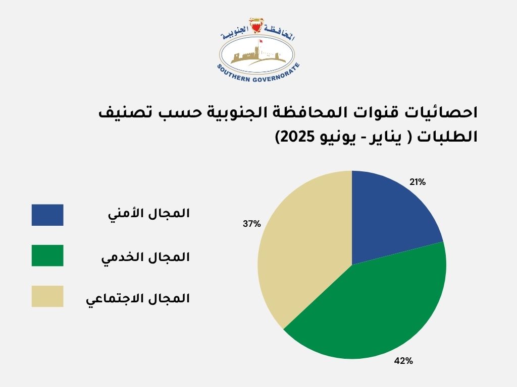 وأوضح سمو المحافظ، بأن المحافظة الجنوبية تقوم بشكل دوري باستحداث تقرير مفصّل عن مجموع الشكاوى والمقترحات والطلبات الواردة عبر قنوات المحافظة المباشرة والإلكترونية، حيث بلغ مجموع الاستفسارات والطلبات لمنتصف العام مع نهاية شهر يونيو 2025 ، في حدود 1209 استفسار وطلب في المجالات الأمنية والخدمية والاجتماعية، في حين تنوعت مجالات الطلبات الواردة عبر برنامج "تواصل" والتي بغلت مجموع 55 طلب ، كما تلقت المحافظة عدد 521 من المكالمات والاستفسارات عن طريق الهاتف، أما من خلال "تطبيق الجنوبية "فقد استقبلت المحافظة 493 طلب ، وعدد 93 من الاستفسارات والمقترحات الواردة عبر البريد الإلكتروني ، بالإضافة إلى عدد 47 من الملاحظات والمقترحات الواردة خلال "مجلس المحافظة " ، كما تشير إحصائيات قنوات التواصل الخاصة بالمحافظة بأن نسبة الطلبات صنفت حسب التقسيم التالي : المجال الأمني بلغت نسبته (21)% ، أما المجال الاجتماعي بنسبة (37)% ، في حين المجال الخدمي بنسبة بلغت (42)% ، وذلك منذ مطلع العام.