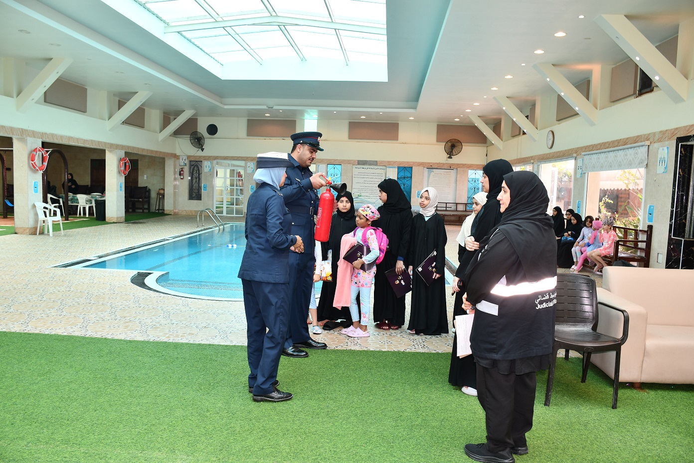 كما قام فريق العمل بتنفيذ زيارات ميدانية ولقاءات مباشرة مع مستخدمي ومشغلي برك السباحة لتقديم الإرشادات والنصائح التوعوية، مع توزيع الكتيبات والملصقات والهدايا التي تعزز ثقافة الوقاية، والتركيز على ضرورة توفر معدات الإطفاء والإنذار، مثل طفايات الحريق، وبطانيات الحريق، وكواشف الدخان والغاز، وإبقاء أسطوانات الغاز خارج مرافق البرك.