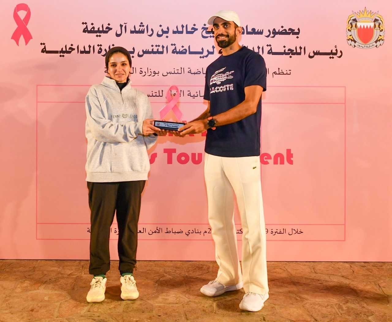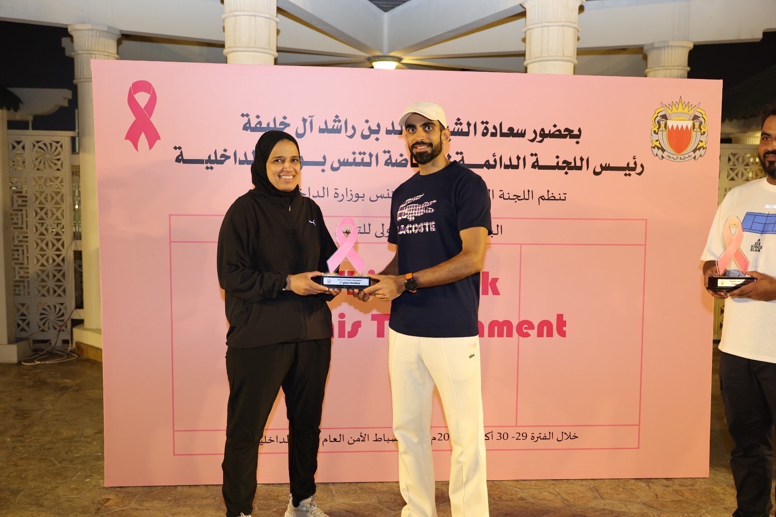 نظمت اللجنة الدائمة للتنس بطولة التنس الأولى للسيدات، تزامناً مع شهر التوعية بمرض السرطان، وذلك بمشاركة 32 لاعبة من منسوبات وزارة الداخلية والاتحاد البحريني للتنس، بالإضافة إلى عدد من الأكاديميات في مملكة البحرين.