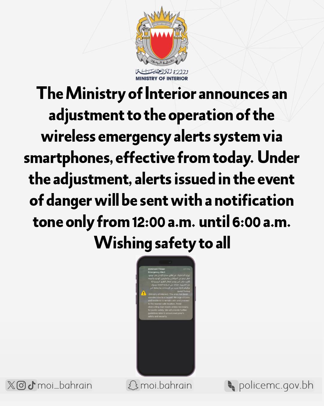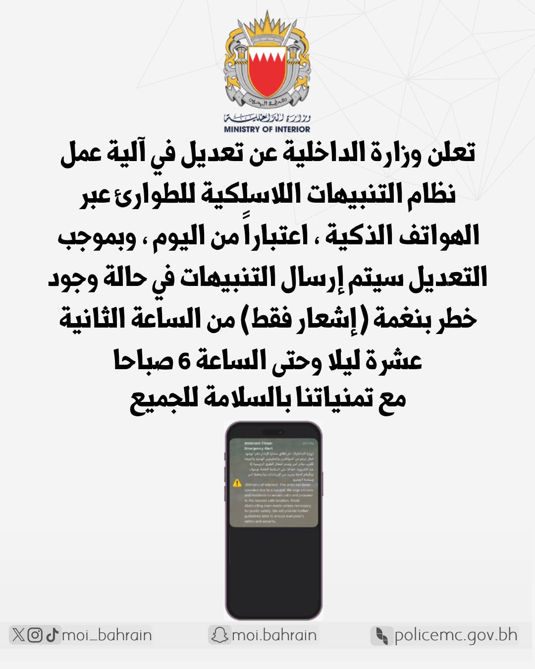 حفاظاً على سلامة البحارة ومرتادي البحر في ظل ما تتعرض له مملكة البحرين من عدوان إيراني سافر ، باستخدام الصواريخ والطائرات المسيرة ، وما يشكله ذلك من خطورة كبيرة على سلامة المواطنين والمقيمين ، تعلن وزارة الداخلية ، حظر الحركة البحرية لمرتادي البحر من مستخدمي سفن الصيد والنزهة ، وذلك في ضوء الإجراءات المتخذة لحماية سواحل البحرين