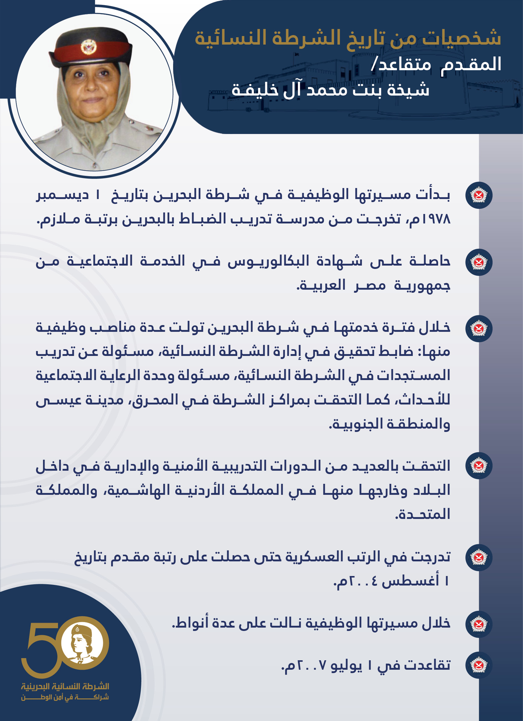 شخصيات من تاريخ الشرطة النسائية بمناسبة يوبيلها الذهبي ( المقدم المتقاعد - شيخة بنت محمد آل خليفة ) 2021/02/21